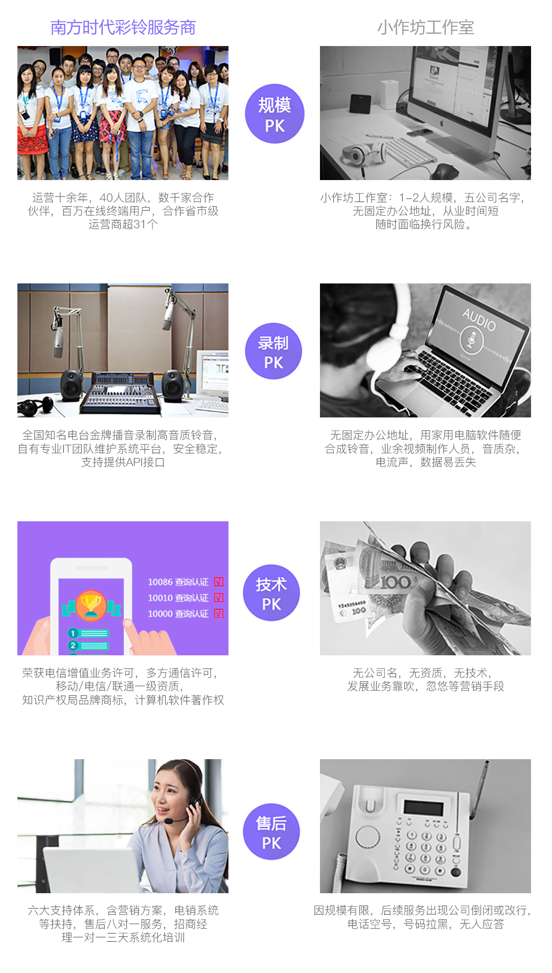 南方时代面向全国各省市县诚招企业彩铃、视频彩铃、号码认证业务代理加盟商,无论大小,只要看好企业信息化服务行业,具有一定经营管理和市场开发能力,能守法经营的法人资格公司或者个人,来吧,我们提供合理的代理空间和共赢空间,一起为中小企业信息化服务发展探索。您的满意,我们的责任!